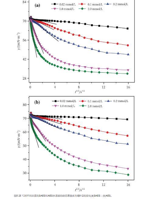 图4 25℃时不同浓度的SAES和AES水溶液的动态表面张力(a)SAES;(b)AES。