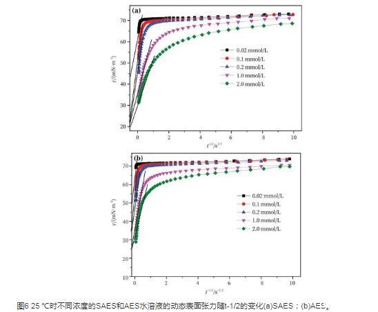 图6 25℃时不同浓度的SAES和AES水溶液的动态表面张力随t-1/2的变化(a)SAES;(b)AES。
