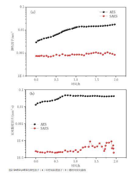 图2 SAES与AES的弹性因子(a)和宏观黏度因子(b)随时间变化曲线