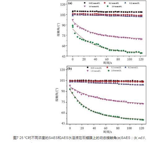 图7 25℃时不同浓度的SAES和AES水溶液在石蜡膜上的动态接触角(a)SAES;(b)AES。