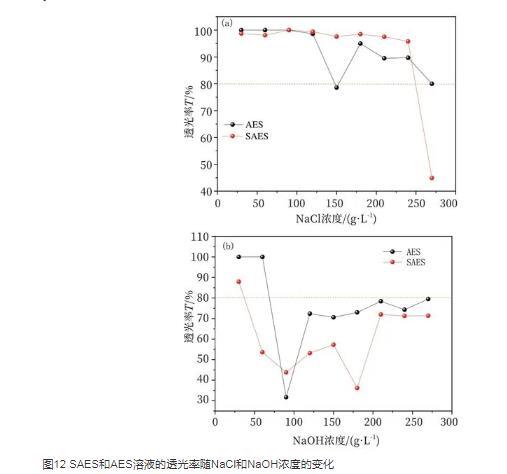 加入一定量的盐/碱可以提高离子型表面活性剂在洗涤及采油等应用中的界面活性,而盐/碱浓度达到一定数值时,会导致表面活性剂从水溶液中析出而降低其表面活性,因此耐盐/碱性较好的表面活性剂有助于扩大其应用范围。从图12中可以看出,SAES耐NaCl盐度约为250 g/L,而AES在300 g/L NaCl盐溶液中透光率数据均在80%及其以上,后者耐NaCl盐性更好;SAES耐NaOH碱度约为30 g/L,AES耐NaOH碱度为约60 g/L,后者耐碱性更好,即SAES的耐盐耐碱性均低于AES。