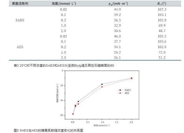 表3 25℃时不同浓度的SAES和AES水溶液的γlg值及其在石蜡表面的θ0