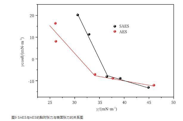 图9 SAES与AES的黏附张力与表面张力的关系图