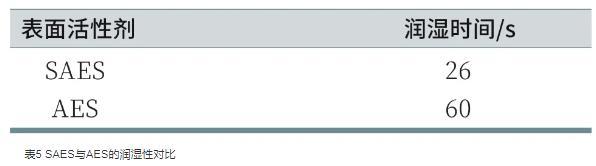 润湿性是表面活性剂的基本应用性能之一。帆布沉降法测定的是表面活性剂溶液对棉布的润湿效果,润湿过程的快慢取决于表面活性剂的性质。由表5可知,SAES、AES对帆布片的润湿时间分别为26 s和60 s,表明SAES的润湿性优于AES,这是由于SAES结构中存在支链,表面活性剂分子从水溶液中迁移到气-液界面的速率较快,容易扩散到纤维表面,降低帆布片表面张力的能力较强,从而具有较好的润湿性。