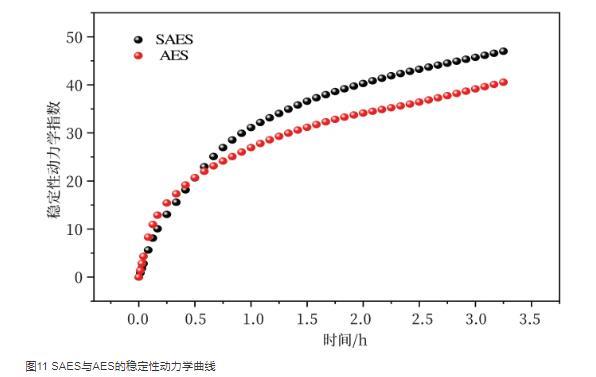 稳定性动力学指数(di)反映的是样品在整个放置时间浓度和颗粒粒径的变化幅度的综合值,稳定性动力学指数越大,系统越不稳定。图11为SAES与AES的稳定性动力学曲线,从图中可以看出,在开始的0.5 h内,SAES与AES的稳定性动力学指数几乎相同,但随着时间的增加,SAES的稳定性动力学指数明显高于AES,说明在开始的0.5 h内,二者的泡沫稳定性几乎相同,但是随着时间的延长,SAES体系的稳泡性明显弱于AES,这是由于带有一定支链的SAES分子在气-液界面上形成的表面膜黏度低,不够紧密结实,泡沫稳定性较差。
