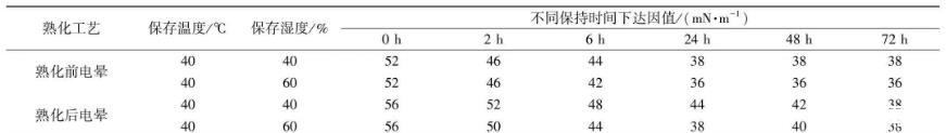 当处于相同的保存温度及保存湿度(40℃/60%)下,电晕后在此环境下熟化24 h后,耐候层达因值即从初始电晕52 mN/m降低到36 mN/m。与之相比,先进行熟化后再电晕后,在此温湿度环境下保存24 h仍可维持38 mN/m以上的水平。随着保存环境湿度的降低(40℃/40%),熟化前电晕保存24 h后,达因值可保持在38 mN/m,熟化后电晕在较低温湿度环境下保存24 h达因值可维持在44 mN/m以上,当保存72 h后达因值仍可保持在38 mN/m以上。因此,当处于相同的保存环境及相同保存时间下,背板熟化后电晕比熟化前电晕耐候层达因值保持更好,维持时间更长。