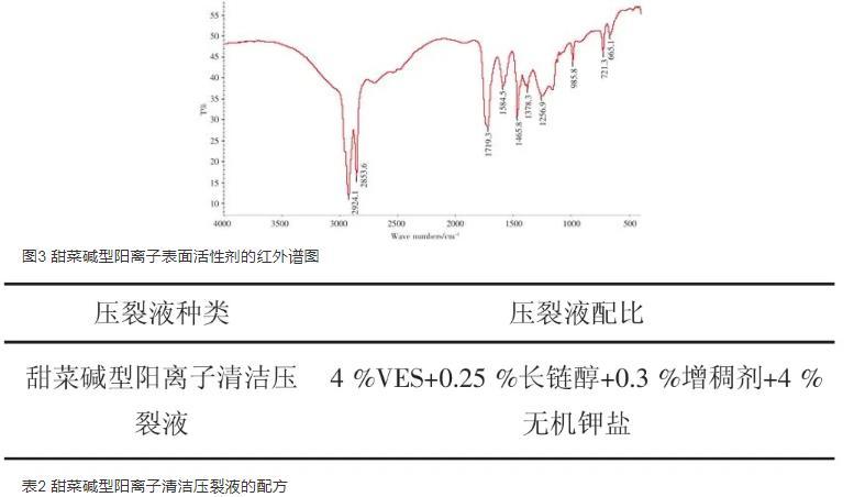 甜菜碱阳离子压裂液体系中主剂是甜菜碱阳离子表面活性剂;使用无机钾盐作为促进表面活性剂成为胶束,并有防膨及黏土稳定作用;增稠剂使用天然的高分子材料,既有增稠的作用又有降滤失作用。