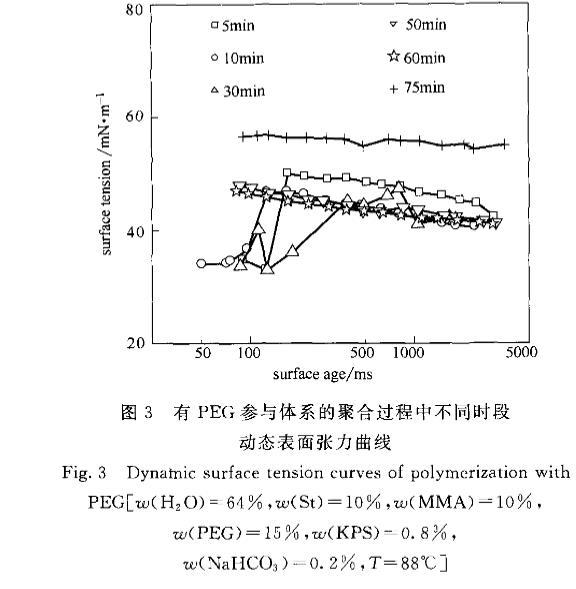 由于PEG的存在,使St/MMA在水相中经历了不一样的聚合过程,PEG会使体系的反应速率变慢,当反应到50min时转化率只有49,而无PEG参与的体系在30min时聚合已接近终点,转化率达到98以上。St/MMA和引发剂形成的聚合物在PEG的作用下,形成了一种具有更强表面活性的聚合物,其表面活性水平高于PEG以及无PEG参与的聚合体系的聚合物,但弱于混合单体及齐聚物。这种较强表面活性的聚合物在转化率只有5的时候就已经存在,是聚合物进入粒子堆形成小粒子且稳定粒子的动力,并最终使粒子带有足够脱离粒子堆的表面电荷。