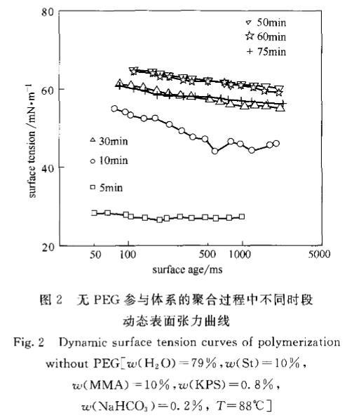 2.2聚合时间对动态表面张力变化趋势的影响经引发,水相中溶解的单体聚合成链,聚合体系的组分也随之发生变化。体系在水相中含有了自由基齐聚物,以及由齐聚物聚集形成的基本粒子或胶束。这些新产生的物质对DST曲线有很明显的影响,加上PEG与聚合物链的相互作用,则使DST曲线有更多的变化。为了能明确地分析PEG在聚合过程中的作用,进行了有PEG和无PEG参与的聚合体系各时间段动态表面张力实验比较。图2和图3分别为St/MMA在无PEG的水中和有PEG的水溶液中DST随聚合时间的变化趋势。