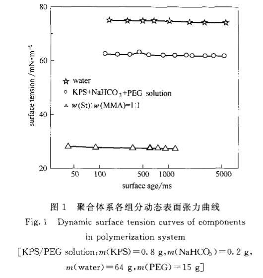 2.1无皂乳液聚合体系组分的动态表面张力未反应前,聚合体系可以分为油相和水相两部分:油相部分主要为单体,水相部分主要为引发剂(过硫酸钾)、pH缓冲剂(NaHCO。)、PEG和水。这两部分的DST曲线如图1所示。