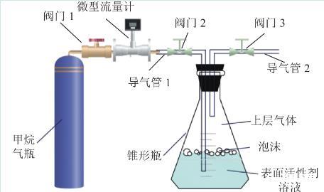采取自主研发的泡沫对气体缓释效应试验装置进行试验,试验装置如图2所示。将250 mL表面活性剂溶液置于密闭锥形瓶,使用微型流量计控制甲烷气体匀速向表面活性剂溶液中以300 mL/min速度通入50 mL气体。试验具体步骤如下: