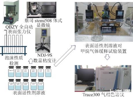 试验流程如图1所示。将两种表面活性剂配置质量分数为0.01%、0.02%、0.05%、0.1%、0.15%的溶液,使用QBZY全自动XVDEVIOS破解版安卓手机安装包对不同质量分数表面活性剂溶液以及去离子水进行表面张力测量,NDJ-9S数显粘度计测表面活性剂溶液黏度,注气法检测溶液泡沫性质,蔡司stemi508体式显微镜观察泡沫形态。上述基础参数测定结束后,使用自行研制的表面活性剂溶液对甲烷缓释试验装置进行泡沫对甲烷缓释效应影响试验,并采用Trace300气相色谱仪定量检测分析。