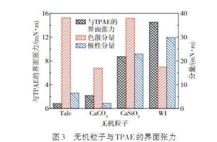 为深入评估4种无机粒子与TPAE之间的相容性,本研究采用界面张力仪、接触角仪计算了4种无机粒子与TPAE之间的界面张力,以定量分析其相容性。如图3所示,可以看出,Talc与TPAE之间的界面张力为0.82 mN/m,表明二者相互作用力较强,能够更好地相互渗透和混合,反映出二者之间存在良好的相容性。