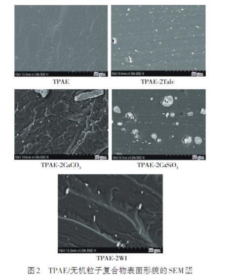 对比之下,含有CaSiO3、CaCO3、WI无机粒子的TPAE复合材料展示出典型的两相形态,这些粒子在TPAE基体中的均匀分散揭示了TPAE与这3种无机粒子之间在热力学上的不相容性。值得注意的是,相比较于TPAE-2CaCO3和TPAE-2WI,TPAE-2CaSiO3复合材料的断面形貌中的CaSiO3粒子表现出明显的团聚现象,这可归因于CaSiO3独特的多孔蜂窝状结构,使得在含量增加时,粒子间相互碰撞并倾向于结合,容易形成更大的聚集体,使得CaSiO3粒子尺寸显著大于其他两种无机粒子。
