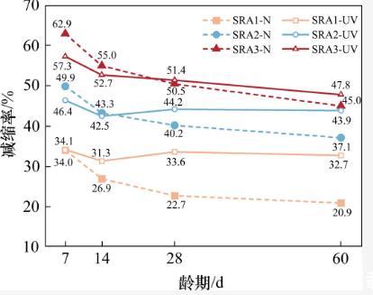 从图3中可以观察到,随着龄期的延长,干缩曲线SRA2-UV逐渐接近于干缩曲线SRA3-UV,而SRA3-UV的干缩值没有进一步降低。这表明上述分析是合理的。在强紫外线辐射下,当减缩剂的掺量超过3%时,其孔隙溶液中的SRA浓度超过临界浓度(CMC),进一步增大掺量不能增强SRA在该应用环境中的减缩效果。