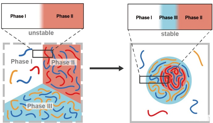 有别于简单两组分(聚阴离子与聚阳离子)体系,多组分聚电解质体系会发生多相复合凝聚而出现共存的多个凝聚相,它们形成嵌套型或串珠型等各种多级分层结构,这些结构的形成与生命体系中的分子定位、定向招募相关,也是蛋白质翻译和核仁应激反应的结构基础。决定凝聚物体系采取何种多级液滴结构的关键因素正是不同共存相间的界面张力。因此,深入研究多相凝聚体系的界面张力具有非常重要的价值。当前理论仅处理简单两组分体系形成的稀相与浓相间的界面,多相分离体系的界面张力尚未得到解决。