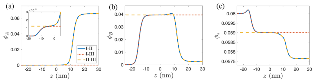 图2.I-II相界面处的物种浓度分布曲线与I-III相界面和II-III相界面的浓度分布曲线对比。蓝色实线为I-II相界面的浓度分布曲线,左侧为I相,右侧为II相;红色点线I-III相界面的浓度分布曲线,左侧为I相,右侧为III相;黄色虚线为II-III相界面的浓度分布曲线,左侧为III相,右侧为II相。