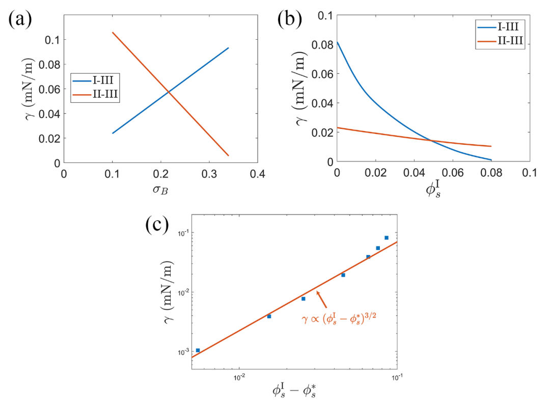 图1.(a)I-III相与II-III相间的界面张力随B链线电荷密度σB变化的曲线。(b)I-III相与II-III相间的界面张力随外加盐离子浓度变化的曲线。(c)接近临界盐时I-III相界面张力与盐浓度之间的标度关系。