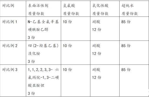 基于表3可以看出,对比例1和实施例1的区别仅在于两亲性离子液体不同,其中,对比例1采用常规的N-乙基全氟辛基磺酰胺乙醇作为表面活性剂,导致表面张力增加,蚀刻选择比降低。对比例2未加入1,1,2,2,3,3-六氟丙烷-1,3-二磺酸亚胺锂,无法调节蚀刻速率。对比例3单独采用1,1,2,2,3,3-六氟丙烷-1,3-二磺酸亚胺锂作为表面活性剂,导致表面张力增加,蚀刻选择比降低,而本发明合成的离子液体同时具有多氟基团、环状结构、多羟基,能够显著降低表面张力,同时提高蚀刻选择比。