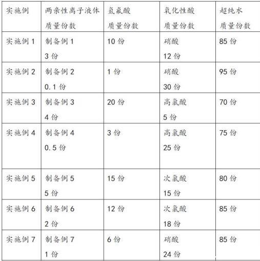 多晶硅蚀刻液实施例1-7包含的组分及摩尔比如表1所示,多晶硅蚀刻液对比例1-3包含的组分及摩尔比如表2所示。按照下表1和表2分别称取各自用量的各个组分,然后将超纯水、氢氟酸、氧化性酸、两亲性离子液体依次加入容器内,充分搅拌溶解,最后采用0.5μm滤芯过滤,即得所述多晶硅蚀刻液。