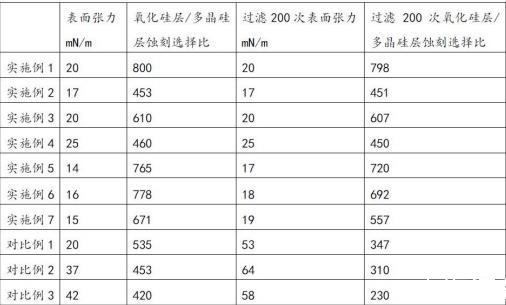 表1:多晶硅蚀刻液的实施例1-实施例7