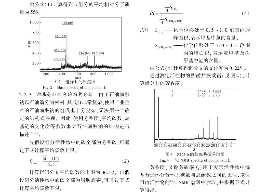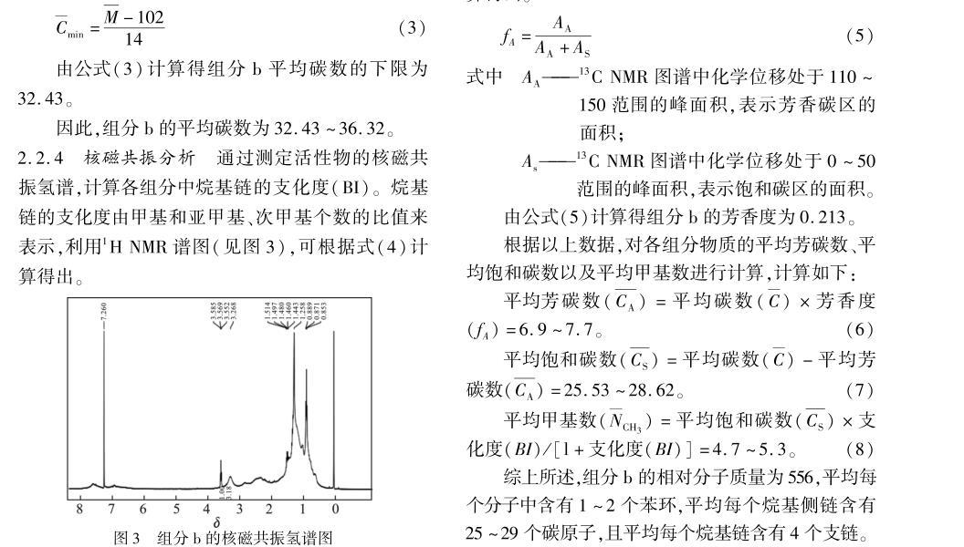 综上所述,组分b的相对分子质量为556,平均每个分子中含有1~2个苯环,平均每个烷基侧链含有25~29个碳原子,且平均每个烷基链含有4个支链。