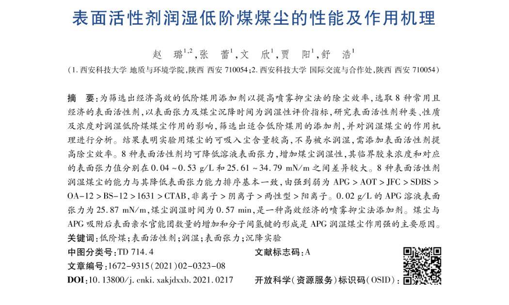摘要:为筛选出经济高效的低阶煤用添加剂以提高喷雾抑尘法的除尘效率,选取8种常用且经济的表面活性剂,以表面张力及煤尘沉降时间为润湿性评价指标,研究表面活性剂种类、性质及浓度对润湿低阶煤煤尘作用的影响,筛选出适合低阶煤用的添加剂,并对润湿煤尘的作用机理进行分析。结果表明实验用煤尘的可吸入尘含量较高,不易被水润湿,需添加表面活性剂提高除尘效率。8种表面活性剂均可降低溶液表面张力,增加煤尘润湿性,其临界胶束浓度和对应的表面张力值分别在0.04~0.53 g/L和25.61~34.79 mN/m之间差异较大。8种表面活性剂润湿煤尘的能力与其降低表面张力能力排序基本一致,由强到弱为APG>AOT>JFC>SDBS>OA-12>BS-12>1631>CTAB,非离子>阴离子>两性型>阳离子。0.02 g/L的APG溶液表面张力为25.87 mN/m,煤尘润湿时间为0.57 min,是一种高效经济的喷雾抑尘法添加剂。煤尘与APG吸附后表面亲水官能团数量的增加和分子间氢键的形成是APG润湿煤尘作用强的主要原因。