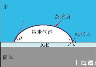 IGE(Interfacial gas enrichment)是指界面气体富集,是由于固液界面处液体中的气体分子含量增多而导致的液体黏度降低。Limbeek在分析纳米气泡稳定性及“反常小”的接触角时,提出了IGE存在的假说。这个假说得到了一些实验支持,Limbeek和Seddon研究发现不同类型气体生成的纳米气泡具有不同的接触角,并把这种现象解释为固体表面上吸附了一层气体分子,而纳米气泡生成在气层上,这使纳米气泡的接触角因气体类型的不同而变化。如果纳米气泡与IGE真的共存,气-水、固-水和固-气自由能会受到影响,纳米气泡的接触角就不能直接利用Young氏方程计算得出。可见,IGE与纳米气泡共存的确会影响纳米气泡的接触角。