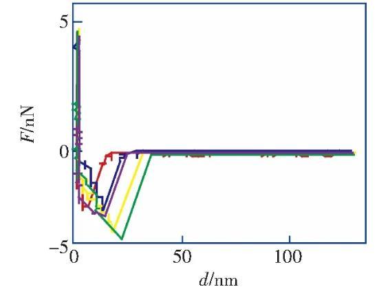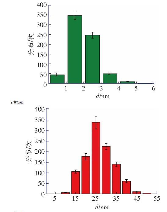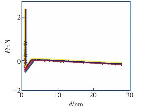 纳米气泡的高度在8~20 nm范围之内,直径在100~500 nm范围之内,图3c为图3b中典型纳米气泡的截面图。扫描得到纳米气泡图像以后,在该表面上进行力曲线测量实验,如图2b所示。所有离曲线的‘跳进’距离均大于10 nm且是变化的,同时,由双电层引起的斥力也消失了,不符合DLVO理论。这种‘跳进’距离不同的长程力应该是因为醇-水替换后HOPG表面上生成的纳米气泡造成的。图3b中纳米气泡的覆盖率约为21.8%,在该表面不同位置测量得到的力曲线必然会存在探针-HOPG相互作用的情况,即不都是探针-气泡的相互作用的情况。然而,根据醇-水替换前后多次测量力曲线得到“跳进”距离d的统计分析(图4a和图4b),醇-水替换前测量得到的力曲线的“跳进”距离大部分都小于5 nm(99%),而醇-水替换后测得的力曲线的“跳进”距离均大于10 nm。这表明,醇-水替换后即使不是探针-气泡相互作用的情况下,探针与HOPG表面的相互作用时仍然存在长程引力,而这应该是IGE造成的。该研究结果与Peng等人的研究结果一致,验证了Limbeek对IGE与纳米气泡共存的假设。