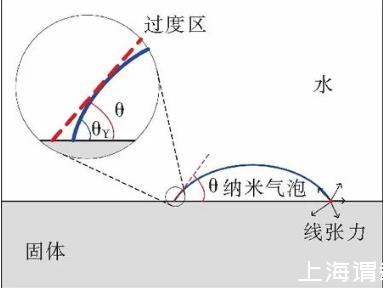 研究发现线张力对纳米气泡接触角的影响是不可忽视的。线张力是指单位长度上三相接触线过剩的自由能。这种过剩自由能的来源有两种:一是由于表面力的存在致使过渡区内局部的界面变形产生的;另一个是过渡区内不饱和分子间的相互作用所使界面张力产生的局部变化。图5是过渡区内由于线张力的影响导致纳米气泡的纳观接触角低于宏观接触角的示意。