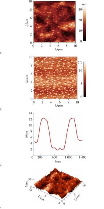 图2a是探针在超纯水中HOPG表面测得的力-位移曲线,当分离距离大于5 nm时,针尖和表面之间的作用力主要为斥力。由于实验中的水呈弱酸性(PH约5.6),而研究表明,HOPG表面在弱酸性水中带弱负电荷,探针针尖(单晶硅)在水中也认为是带弱负电荷。因此,这个斥力可以解释为双电层(Electrostatic double layer,EDL)引起的。当分离距离小于5 nm时,在范德华力的作用下,针尖产生‘跳进’(jump in)现象并与HOPG表面接触,整个力曲线符合DLVO理论。醇-水替换之后,在10 10扫描区域内采用Taping-Mode模式(95%的set-point)以1 Hz的扫描频率,如图3a所示,HOPG表面上生成的纳米气泡呈球冠状,相应的三维图如图3d所示。