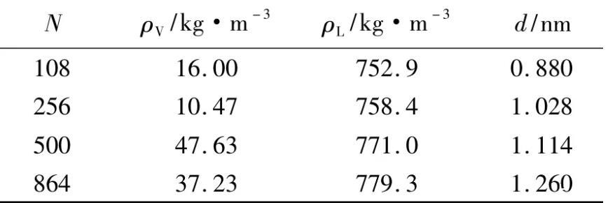 在温度500 K和截断半径rc=0.9498 nm的条件下,当模拟分子数N=108、256、500和864时,模拟得到的密度分布见图9。统计得到的汽相主体密度ρV、液相主体密度ρL及汽液界面厚度d见表5。