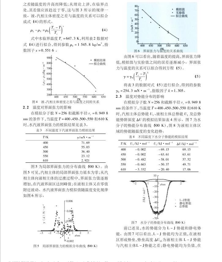 采用SPC模型,对水汽液界面特性的分子动力学模拟研究结果表明,随着温度的升高,汽相主体密度增加,汽液界面厚度增大,液相主体密度降低,界面张力逐渐减小,液相主体区域势能的势阱深度也逐渐降低。随着模拟分子数的增加,液相主体密度增加,汽液界面厚度稍有增大。随着截断半径的增加,液相主体密度增加,汽液界面厚度变化不大。