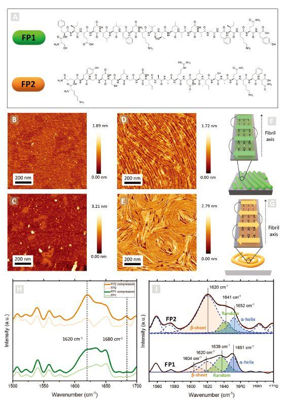 图2、A)FP1和FP2肽的化学结构。FP1(B和D)和FP2(C和E)肽LB膜的AFM显微照片分别在无压缩(B和C)和20 mN m-1(D和E)的情况下转移到新鲜切割的云母基底上。F,G)导致纤维形成的肽β-折叠二级结构的示意图。H)在这项工作中研究的样品的LDIR光谱。I)将酰胺I带解卷积为其主要成分。