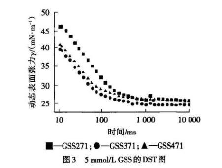 为此,有关连接基的研究较多集中在对静态性能方面的分析,而对动态性能的研究较少。本实验对自主研发的乙二醇双子琥珀酸二仲辛酯磺酸钠(GSS271)、1,3-丙二醇双子琥珀酸二仲辛酯磺酸钠(GSS371)与1,4-丁二醇双子琥珀酸二仲辛酯磺酸钠(GSS471)阴离子双子表面活性剂的DST进行研究,并考察连接基对动态表面性能的影响,探讨其吸附动力学机理。