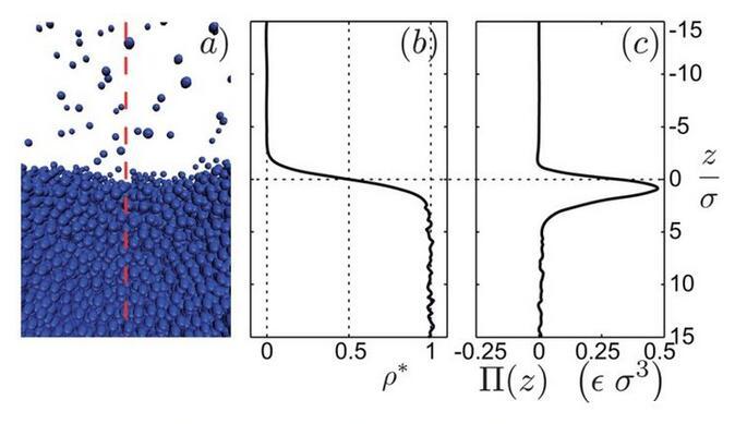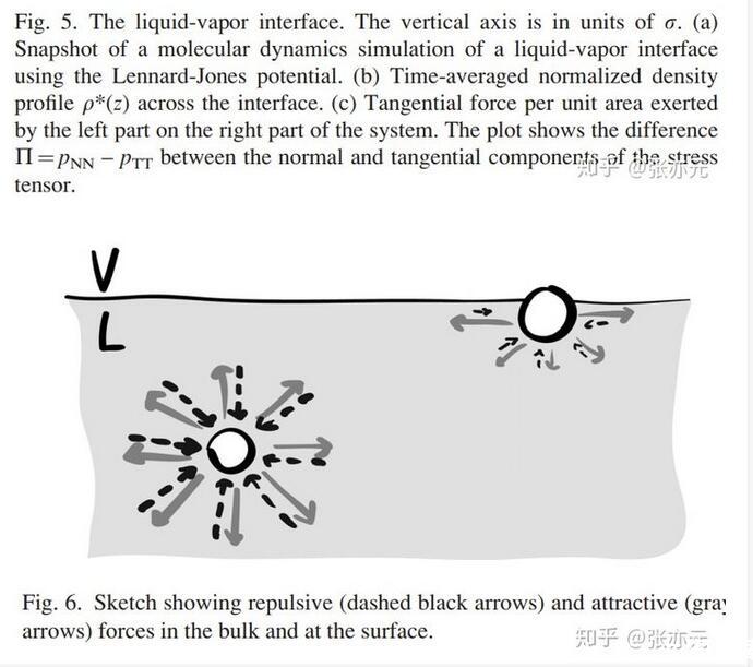 当分子间距较小时,斥力为主,分子间距较大时,引力为主。在斥力与引力平衡时,Lennard-Jones势能最小。现在,XVDEVIOS官方下载免费版就可以来详细地考虑液-气界面了。图5a是通过分子动力学仿真得出的液-气界面照片,对应的时间平均密度分布图是图5b。从高密度的液体到低密度的气体发生在一个几个分子厚度的窄区域。为了确定毛细力,XVDEVIOS官方下载免费版沿垂直界面方向将系统分为两个子系统(图5a)。考虑左边子系统对右边子系统的单位面积的作用力,即应力,在竖直方向上的分布。这个力有两个来源:压力P和额外压力Π(图5c)。图5c表明有个力局部存在于界面附近,其实这个力就是表面张力,且这个力范围和密度突变的范围很相似。这说明表面张力的确是一个真实的力,而不仅仅是表面能的一种纯数学描述。既然XVDEVIOS官方下载免费版发现在界面附近的确局部存在一个平行的力,那XVDEVIOS官方下载免费版回到问题1,为什么表面张力平行于界面而不是垂直于界面?XVDEVIOS官方下载免费版注意到图1仅仅描绘了分子间引力作用。更全面的图应该如图6所示,包含了引力与斥力作用。在远离界面的液体本体内,由于液体分子周围的完全对称性,分子的受力完全平衡。但是,靠近界面附近的地方,上下对称性被打破。为修复竖直方向的力平衡,向上的斥力需平衡向下的引力。而在平行于界面的方向,对称性仍然存在,平行于界面方向的力平衡仍然存在。这就可以存在一种情况,引力作用的强度与斥力作用的强度不同。实际上,在界面附近的水平方向上,引力作用比斥力更强,这产生了表面张力。