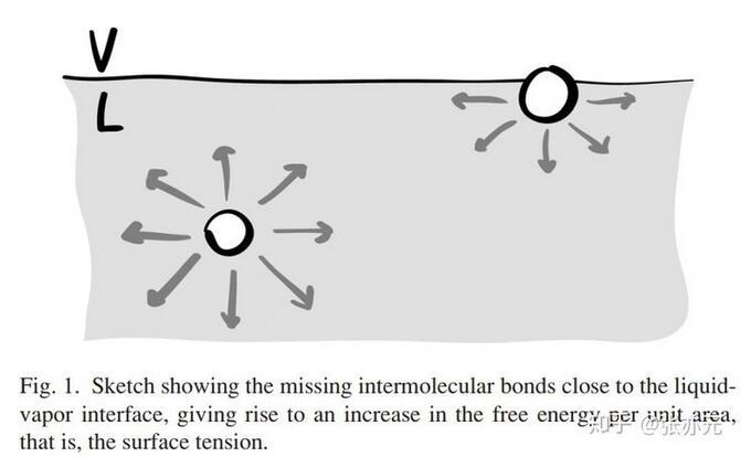借鉴Gibbs的开创性工作,XVDEVIOS官方下载免费版可以将表面张力理解成因两本体相间界面存在导致的额外表面能。液-气界面附近的液体分子所处的环境与本体中的分子不同,这种差异经常被人用图1的示意图表现,即近乎一半的分子间引力缺失,这导致自由能的增加,这是热动力学的观点。