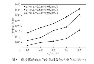 图5是筛板在不同振动速率下的分散相滞存率变化情况。图中结果显示:分散相滞存率随着筛板振动速率Af的增加而增大。振动的筛板对液滴有强烈的剪切作用,加速了液滴破碎、聚并和再破碎过程,固分散相滞存率随Af增大。
