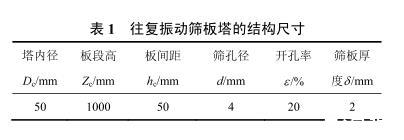 实验是在内径50 mm、有效高度1500 mm的往复筛板塔中进行,实验设备流程图见图1。塔身为玻璃材质,塔顶和塔底有沉降段,筛板在塔顶的调速直流电机通过曲轴带动筛板产生上下往复振动,振幅固定25 mm,振动频率0~1.4 Hz。筛板材质为不锈钢,不同于Karr振动筛板塔的大孔径和高开孔率,本实验采用的筛板孔径和开孔率相对较小,振动萃取段为1000 mm。萃取塔的具体结构参数见表1。