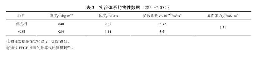 实验运行稳定后,从塔顶和塔底的出口处采样,用滴定法测定样品中丁二酸的浓度。分散相滞存率的测定采用体积置换法,液泛条件通过增大两相流速直到发生液泛来测得。实验体系的物性数据见表2。