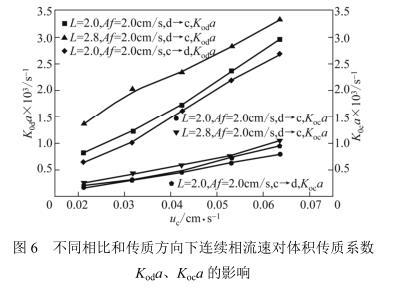 两相流速、相比与传质方向对体积传质系数的影响见图6。图中结果显示:分别用有机相溶质浓度和水相溶质浓度表示传质推动力得到的体积传质系数Koda和Koca随着连续相流速的增加而增大,传质方向相同(d→c)时,高相比的体积传质系数(Koda或Koca)大于低相比的体积传质系数。其原因主要还在于高流速和高相比的情况下,传质相界面积a更大。