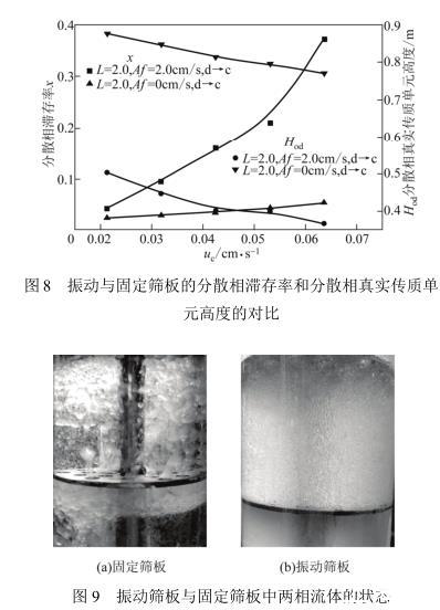 图8给出了正丁醇-丁二酸-水体系分别在振动筛板塔与固定筛板塔中的分散相滞存率和分散相“真实”传质单元高度的对比。图中显示振动筛板塔中分散相滞存率x明显高于固定筛板塔中的x,传质单元高度Hod远低于固定筛板塔的Hod,而且振动筛板塔的x受连续相流速影响大,固定筛板塔的x受流速的影响微乎其微。这是由于两种塔的萃取状态不同(图9),固定筛板塔的操作处于混合-澄清区[图9(a)],振动筛板塔的操作处于分散区[图9(b)]。