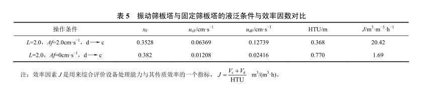 表5振动筛板塔与固定筛板塔的液泛条件与效率因数对比