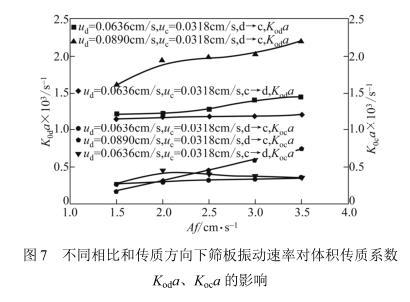图7不同相比和传质方向下筛板振动速率对体积传质系数Koda、Koca的影响