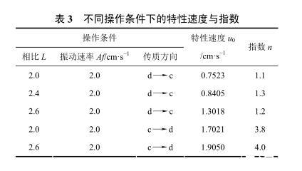 由表3中数据可以看出d→c的指数n在1.2左右,c→d的n在3.9左右,说明指数只与体系的物性有关,与操作条件无关,传质方向不同导致指数n不同主要是有机相和水相分别作分散相的缘故。而特性速度与相比有关。由表3实验结果可以看出,正丁醇-丁二酸-水体系的特性速度同时受两相流速、相比和传质方向的影响,它们都对液滴大小有影响。