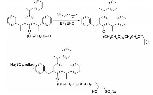 采用“一锅煮”法制备表面活性剂,合成路线如图1所示。将一个带有机械搅拌器,回流冷凝管和恒压滴液漏斗的500 mL三颈瓶置于80℃的恒温水浴中,先后加入92 g的三苯乙烯苯酚聚氧乙烯醚-25和75 mL的正庚烷,向搅拌后形成的溶液中加入2 mL的三氟化硼乙醚催化剂,用恒压滴液漏斗滴加过量的环氧氯丙烷溶液,滴加完后升温至90℃反应3 h;然后滴加20%NaOH水溶液,维持反应体系的pH值在7.5~9,TLC监测反应进程到原料点消失后结束反应。向产物中加入二甲亚砜,溶解后过滤除去反应中生成的盐;用正庚烷萃取、水洗后旋转蒸发除去溶剂;将粗产物溶解于乙醇中,向其中滴加100 mL的25%的亚硫酸钠溶液,分批加入6 mol/L的盐酸溶液维持反应体系的pH值在7~9,在80℃的恒温水浴中继续反应过夜,将反应物用热的异丙醇萃取后过滤除去无机盐,将滤液旋转蒸发除去溶剂得到黄色产物三苯乙烯基聚氧乙烯醚羟丙基磺酸钠,即为表面活性剂TPHS。