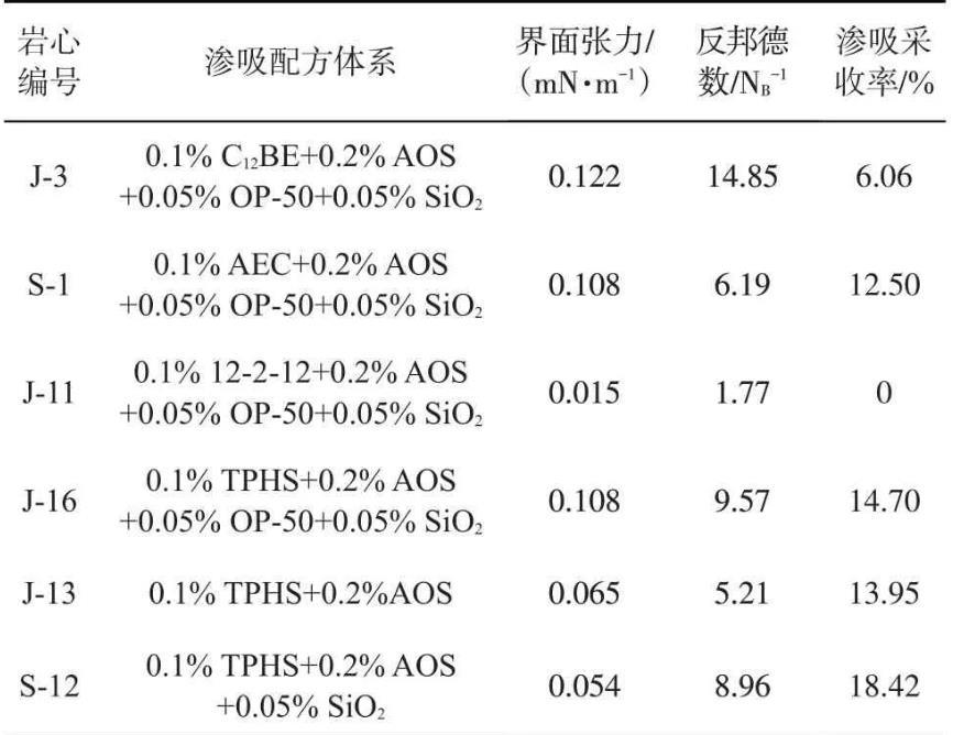 为验证TPHS活性纳米流体在渗吸采收率的应用,采用静态渗吸实验开展TPHS及常见表面活性剂复配溶液渗吸效果对比研究,岩心的基本物性参数见表2,不同体系与原油间的界面张力、所计算的反邦德数和渗吸采收率结果见表3,结果表明在渗吸过程中毛管力起主导作用。