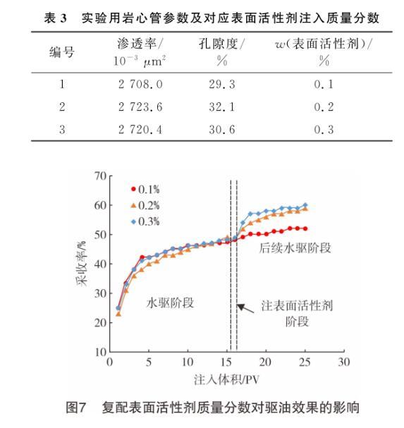 图7为复配表面活性剂在模拟油藏条件下的岩心管(岩心管具体参数及对应表面活性剂的注入质量分数见表3)驱油实验效果。由图7可知,注入不同质量分数的复配表面活性剂后,后续水驱阶段原油采收率均比前期水驱阶段有所提高。当表面活性剂质量分数分别为0.1%、0.2%和0.3%时,采收率分别提高了5.8%、9.4%和10.3%。通过对比质量分数大小与采收率增幅发现:当表面活性剂质量分数由0.1%增至0.2%时,采收率增加了3.6%;当表面活性剂质量分数由0.2%增至0.3%时,采收率仅增加了0.9%。因此,从成本角度考虑,建议将表面活性剂的使用质量分数控制在0.2%~0.3%。