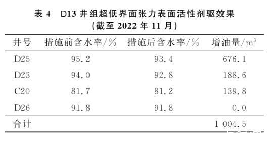 油藏评估结果显示,D13井所控区域剩余可采储量约6.7×104m3,剩余可采储量较大。为挖掘该井所控区域油藏潜力,2022年4月开始对该井进行超低界面张力表面活性剂驱油先导性试验,2022年10月结束,共计注入表面活性剂溶液3 600 m3。考虑到滞留损失,试验将表面活性剂质量分数设计为0.3%。在注入过程中,注入压力由8.9 MPa逐渐上升至10.2 MPa,分析认为表面活性剂在地层中将剩余油乳化,乳化形成的油滴产生叠加的贾敏效应所致。从表3的试验结果可知,截至2022年11月,施工结束1个月后,D13井对应4口生产井中,除D26井因注采井距相对较远,尚未见效外,其余3口井均已开始逐渐见效。见效井含水率下降0.5%~1.8%,1个月内已实现在水驱基础上增油1 004.5 m3,这说明超低界面张力表面活性剂能实现剩余油的有效启动。