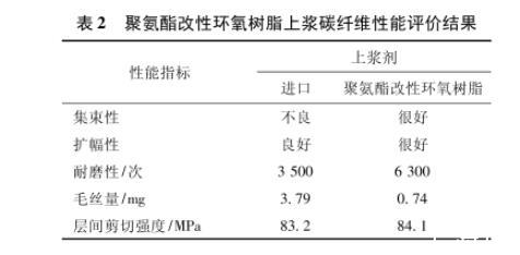 采用聚氨酯改性环氧树脂上浆剂制备的碳纤维性能见表2。